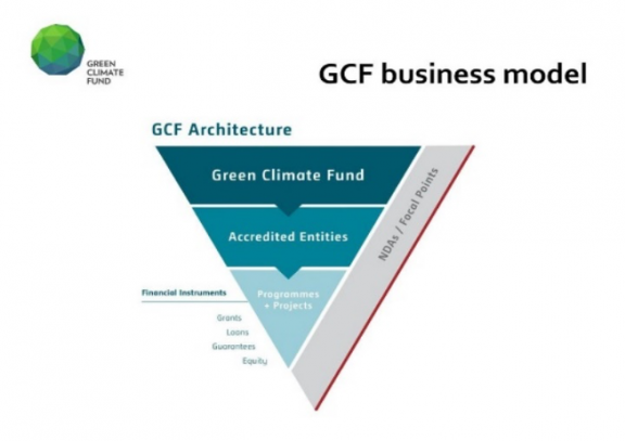 Operationalizing country ownership: Most international organizations, including the GCF, use in-country focal points to liaise with for delivering projects. GCF’s interaction with countries and governments is done primarily through the National Designated Authorities (NDAs) or national focal points (see Image I). The GCF has successfully supported the establishment of NDAs in more than 150 eligible countries. In the GCF business model, NDAs provide written consent from the government for any investment that is being requested from the GCF. In theory, this is expected to ensure that GCF investments align with national plans and strategies. In practice, however, NDAs are considered especially weak when it comes to providing oversight when implementing projects approved by the GCF and engaging with the private sector. This weakness is worrisome especially given the dire need for private sector investments if we were to limit temperature increases to 1.5 degrees.