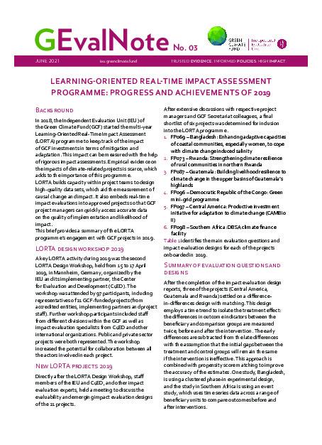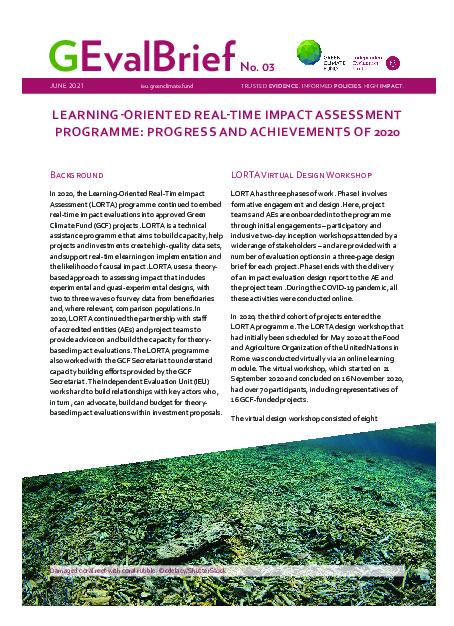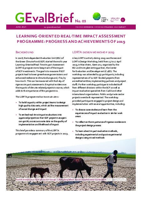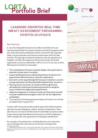 The multi-year Learning-Oriented Real-Time Impact Assessment (LORTA) programme keeps track of the impact of GCF investments. Its goal is to assist GCF projects measure their impact in lowering greenhouse gas emissions and enhancing resilience to climate change, and if so, by how much. LORTA’s assistance includes, among other things, building and clarifying theories of change, co-building real-time and longer term measurement systems and helping projects use quantitative and qualitative...