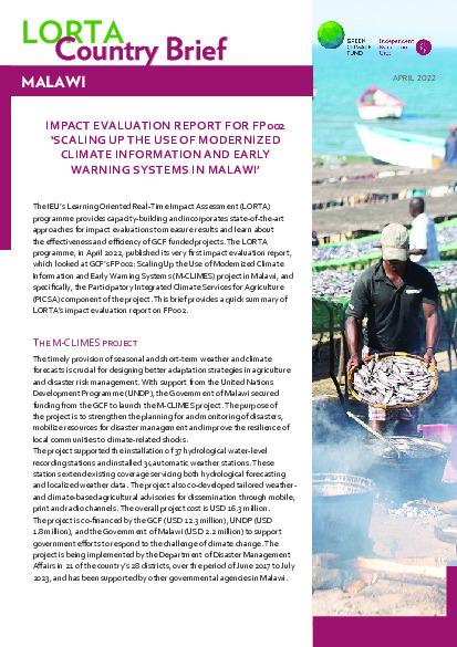 This report assesses the impact of the Green Climate Fund's FP002 "Scaling up the Use of Modernized Climate Information and Early Warning Systems in Malawi". The impact evaluation focuses on the Participatory Integrated Climate Services for Agriculture (PICSA) component of the projects and its impact on the climate resilience of farmers supported within FP002.