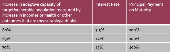 Despite these challenges, an opportunity exists for ‘climate impact bonds’ or bonds that also achieve climate change and resilience-related impacts along with financial returns. A possible contract between an investor and an outcome payer could look like this: