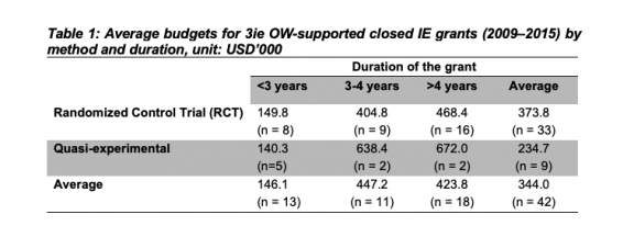 The cost of conducting impact evaluations depends on the programme being evaluated, its study design, sample size, the desired effect size, other outcomes of interest and the local context, etc. On average, 3ie funded impact evaluations cost about USD 334,000 (see Table 1).