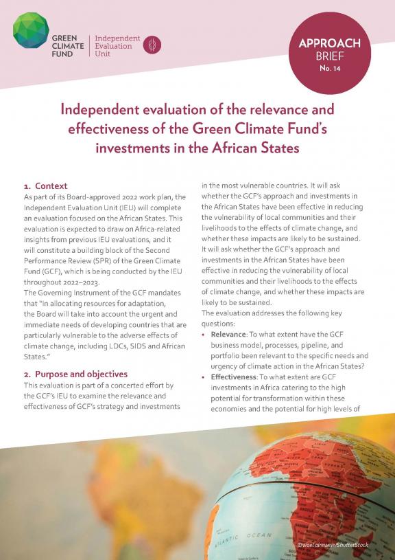The Second Performance Review of the Green Climate Fund covers the GCF-1 period and seeks to inform, among other things, the next update to the strategic plan (USP-2), currently being discussed for the GCF-2 period (2024–2027). The scope of the SPR includes (1) evaluating the GCF’s progress in delivering on its mandate as set out in the GI and its strategic and operational priorities and actions as outlined in the USP, and (2) the performance of the GCF in promoting a paradigm shift towards low...