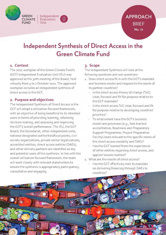 The synthesis of Direct Access in the Green Climate Fund was conducted to assess and provide learning on the Fund’s implementation of the direct access concept and approach and to improve the relevance and performance of the GCF’s direct access modality as a way of accessing financing from the Fund. This independent synthesis used a utilization-focused framework, with the objective of being beneficial to its intended users in terms of providing learning, informing decision-making, and assessing...