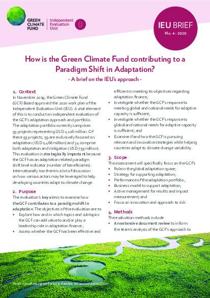Small island developing States (SIDS) face numerous climate threats, such as rising temperatures, changing rainfall patterns, flooding, drought and coral reef decline. Due to rising sea levels many SIDS expect to face food and freshwater insecurity. This 2020 2-page note introduces decision makers to the key points of the IEU’s evaluation of the relevance and effectiveness of the GCF’s investments in SIDS. It describes in clear terms the evaluation’s background, context, conclusions,...
