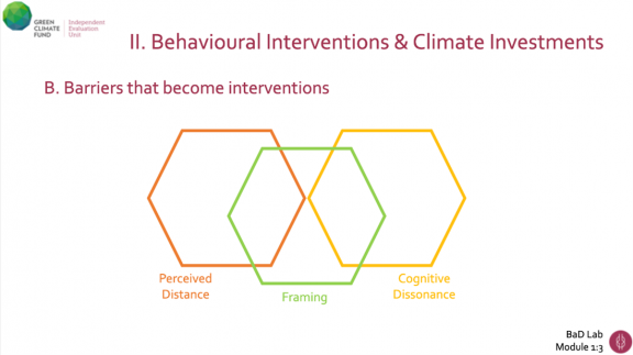The Unit has created a digital Behaviour and Design Toolbox to synthesize evidence and develop guidance on how to evaluate behavioural changes activated by GCF projects. It was built with support from Busara as well as Rare’s Center for Behavior and the Environment. The Toolbox currently contains two parts. Part 1 introduces biases and heuristics to illustrate how behavioural barriers can be overcome in climate projects. It builds on three biases from the BaD Lab’s learning paper, “Going the Last Mile: Behavioural Science and Investments in Climate Change Mitigation and Adaptation” (Kruger and Puri, 2020), which are i) perceived distance, ii) cognitive dissonance, and iii) framing. Evidence on the human brain demonstrates that biases such as perceiving climate change as a futuristic or geographically distant problem, discomfort about a gap between necessary actions and individual capacity, or mitigative options that have been framed in a disastrous tone, will inevitably build barriers that prevent immediate decisions or actions to counter climate change. However, the great news about biases, as the Toolbox will show, is that identifying them actually presents opportunities for the same biases to be turned around as interventions.