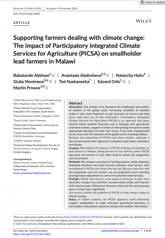 This document explores the impact of Participatory Integrated Climate Services for Agriculture (PICSA) on lead farmers in Malawi, addressing how this innovative approach equips smallholders to adapt to the challenges of climate change. PICSA integrates localized weather forecasts with farmer training and participatory decision-making to optimize agricultural outcomes. By comparing lead farmers who participated in PICSA with those who did not, the study reveals significant improvements in farming practices, maize yields, and food security.