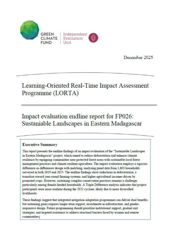 This Impact Insights brief presents emerging findings from the six-year impact evaluation of GCF’s FP026 project in Madagascar. Conducted under the IEU’s LORTA programme, the study explores how forest conservation efforts can align with improved livelihoods and resilience. The brief highlights reductions in deforestation, income gains from climate-resilient crops, and the importance of sustained support systems, especially for female-headed households.