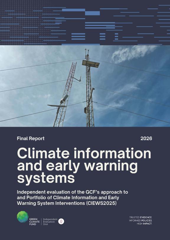 This evaluation report examines how the GCF has supported developing countries to strengthen resilience, preparedness, and response to climate change. It assesses the Fund’s strategic positioning, partnerships, and use of programmatic modalities and funding windows, including readiness and project preparation support, to advance accessible, sustainable, and effective CIEWS interventions. Reviewing a portfolio of CIEWS-tagged projects that has grown over the past decade, the evaluation traces...