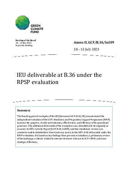 The Board-approved workplan of the IEU (document GCF/B.34/28) commissioned the independent evaluation of the GCF’s Readiness and Preparatory Support Programme (RPSP) to assess the progress, results and outcomes, effectiveness, and efficiency of its operational processes. This additional deliverable of the evaluation was submitted at B.36 originally as an annex to IEU’s Activity Report (GCF/B.36/Inf.09), and this standalone version was created to enable stakeholders’ direct and easy access to...